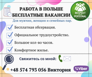 ⚡Агентство Respekt Personal ⚡ ✅Занимаемся трудоустройством по всей Польше ✅Все вакансии бесплатные(мужчины, женщины,сем.пары) ✅Бесплатные консультации по трудоустройству и легализации ✅Предоставляем ж…